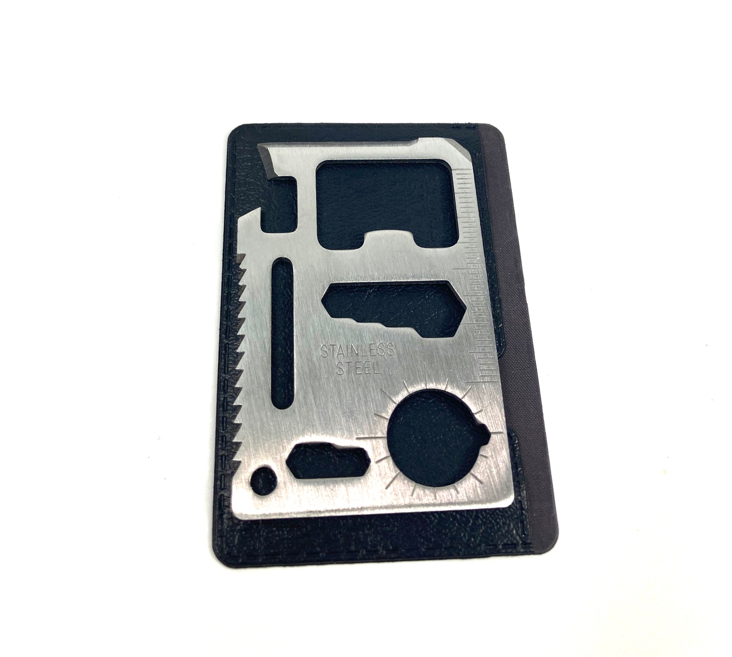 Multiverktyg i rostfritt stål som bland annat har sågblad, knivsegg, burköppnare, skruvmejsel, linjal, flasköppnare, skiftnyckel. mm