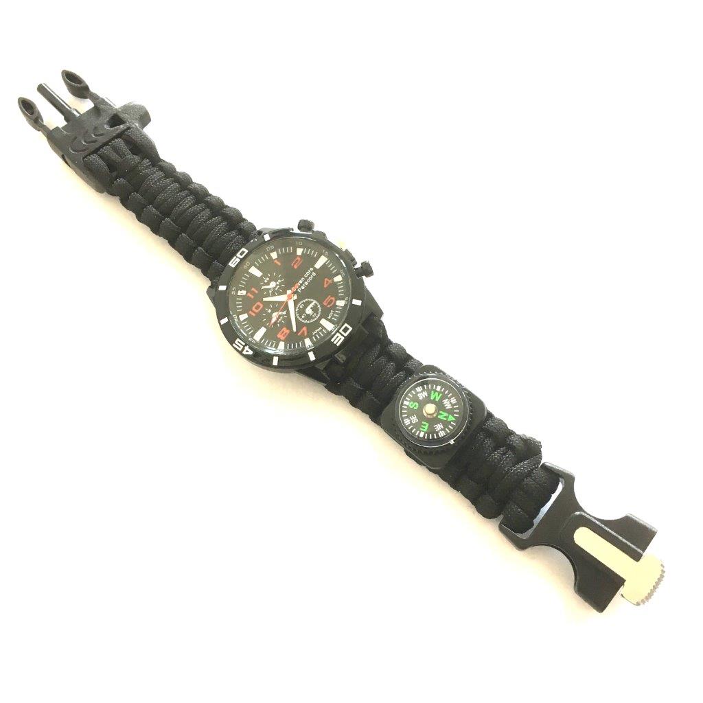 Enkel och stadig klocka på paracordarmband med många nyttiga funktioner: