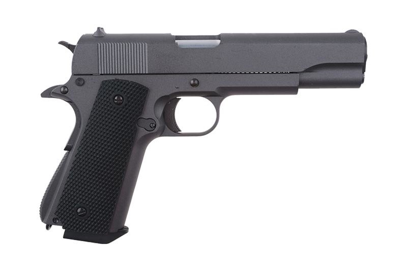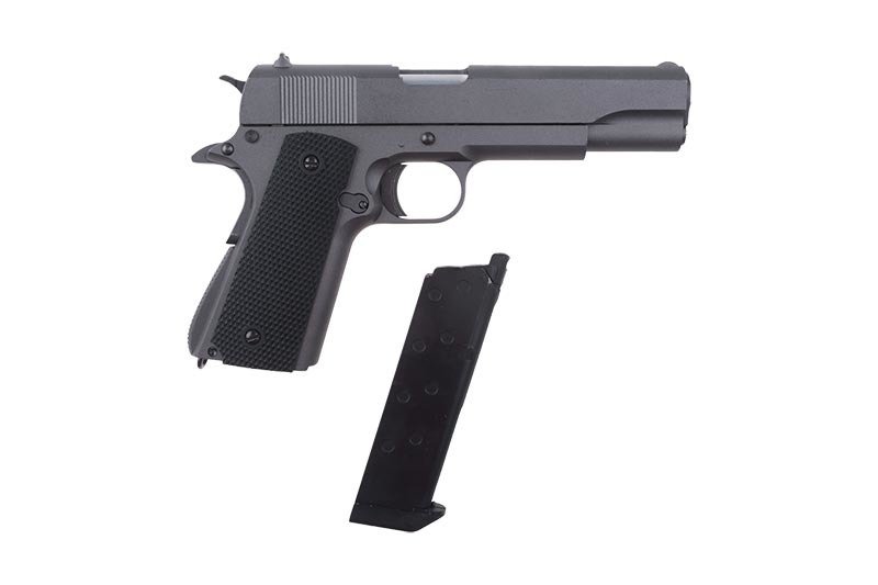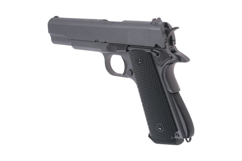 The gas container is located in a magazine with a capacity of up to 25 BBs. The set includes a magazine powered by Green Gas. The replica features a Blow Back system, which significantly increases the dose of realism while firing from the replica due to the slide being pulled back with each shot, as is the case in the live firearm. After the last BB has left the barrel, the slide remains locked in the rear position.